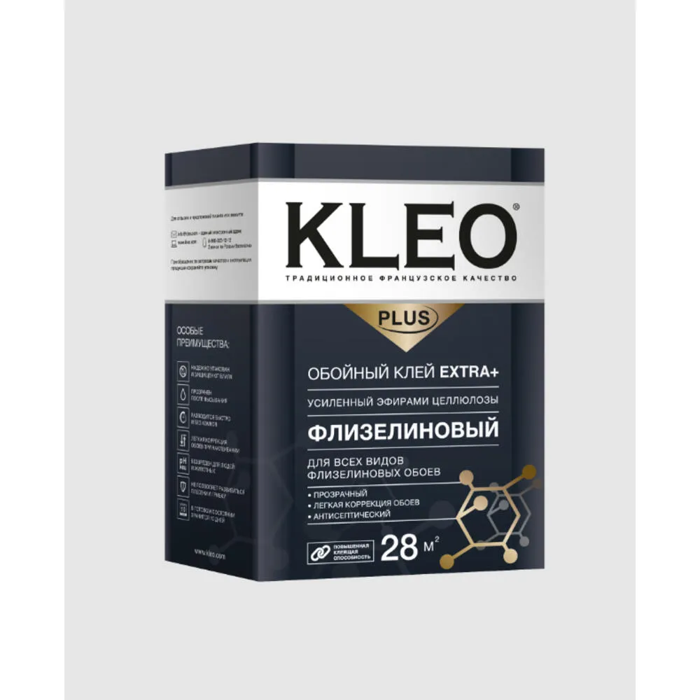 Клей KLEO Extra Plus 28 д/флизелиновых обоев 170г 28кв.м – предназначен для приклеивания обоев на флизелиновой основе, структурных, текстильных и виниловых обоев.