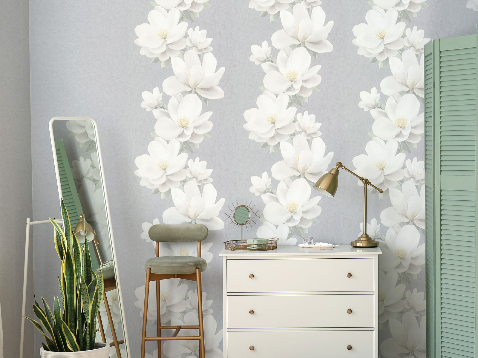 Лёгкое мерцание декоративных элементов подсвечивает лепестки, придавая рисунку объём. Деликатная игра света создаёт приглушённое сияние, а рельефная фактура делает стены выразительными.