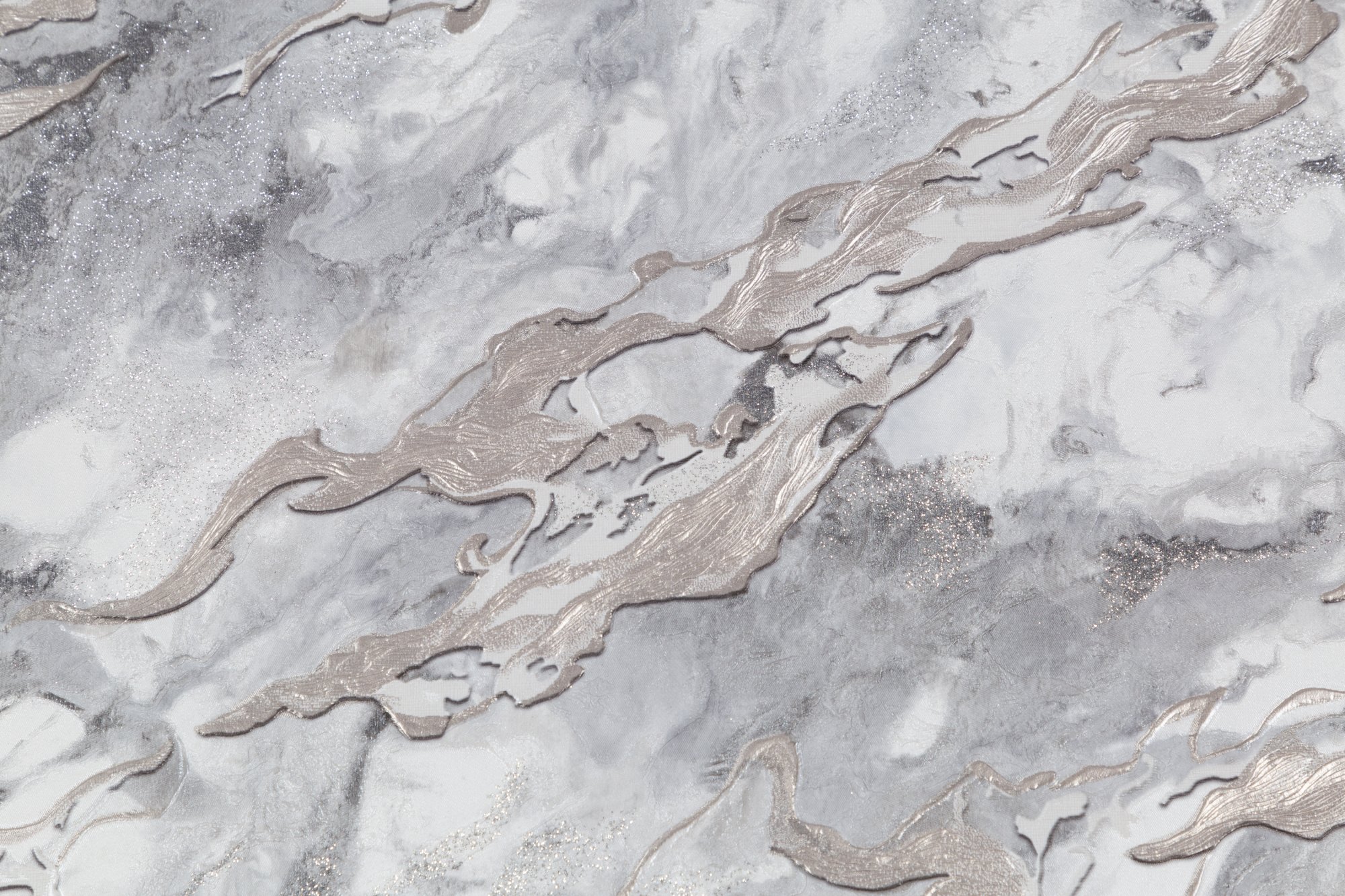 Рельеф природного камня подсвечен разноцветным драгоценным декором, который красиво мерцает на свету. Декор состоит из оттенков популярных металлов – золота и серебра. В оформлении фона его уравновешивает деликатный перламутр и блестящая слюда.