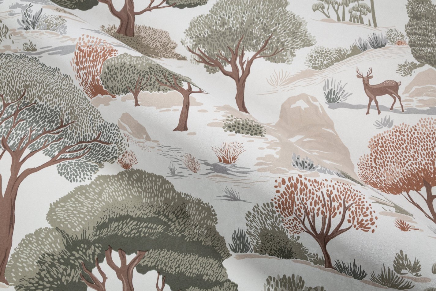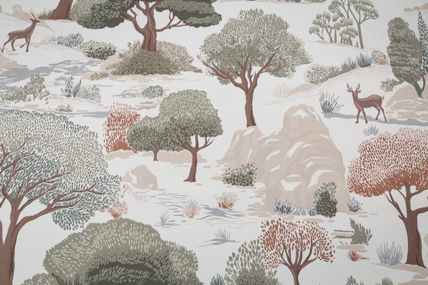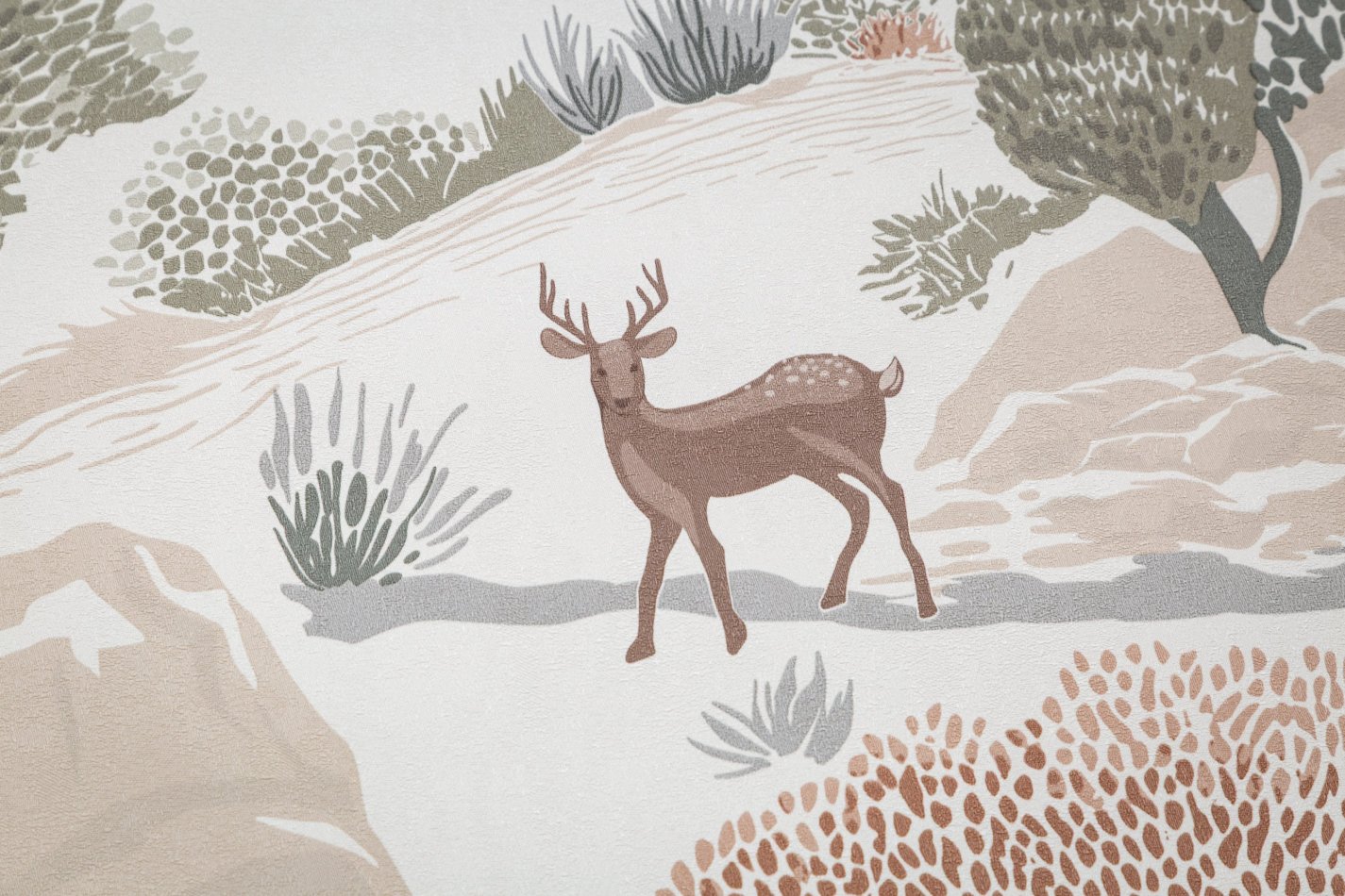 Сюжет наполнен уютной атмосферой сказочного леса – стройные деревья, скалистые холмы и изящные силуэты оленей смотрятся как иллюстрации из детских книжек. Словно созданный рукой художника-декоратора рисунок наполняет комнату природным спокойствием.