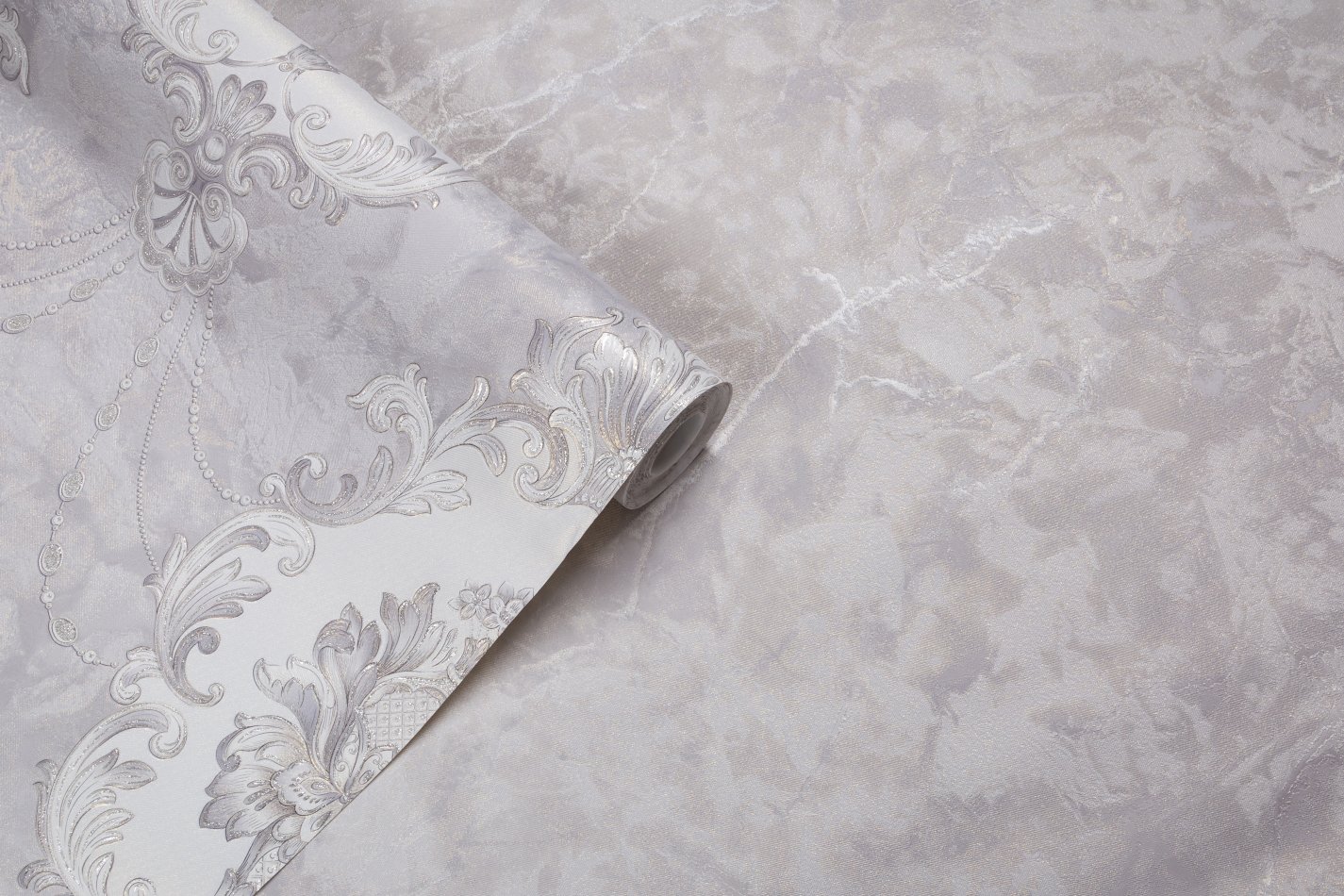 Обои выделяются богатством декоративных приёмов — рельефный орнамент оживает благодаря сверкающим драгоценным штрихам и мягкому перламутровому сиянию. Блестящие золотые и серебряные нюансы окаймляют завитки классических узоров и превращают поверхность в настоящую жемчужину интерьера.