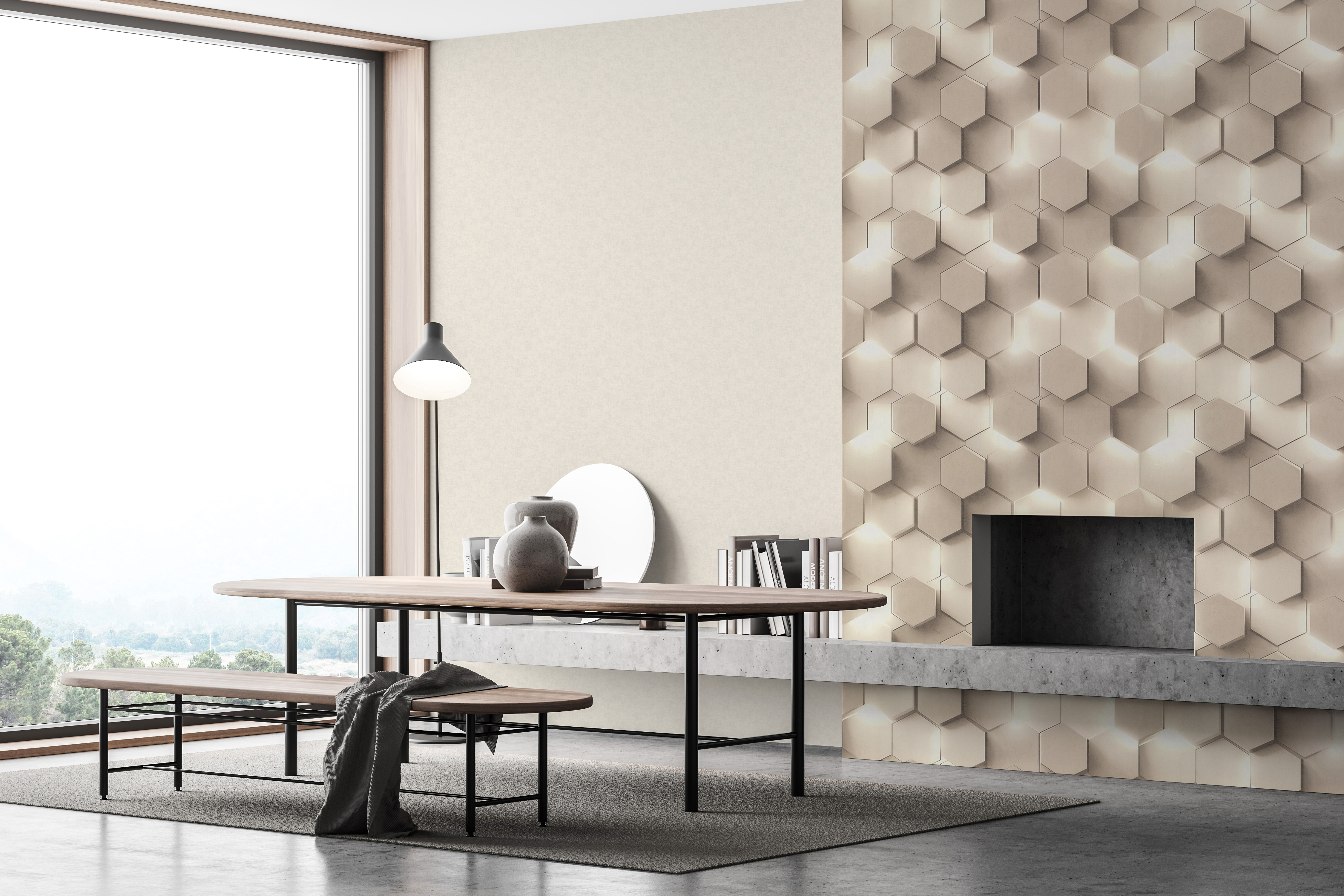 Матовая фактура штукатурки служит фоном для чёткого, но не навязчивого орнамента. Идеальные соты то проступают сквозь реалистичную текстуру, то мягко растворяются в ней. Иллюзия выразительного 3D-эффекта достигается за счёт сложных колористических решений и имитации подсветки – как будто яркий свет прорывается сквозь графичные детали рисунка.