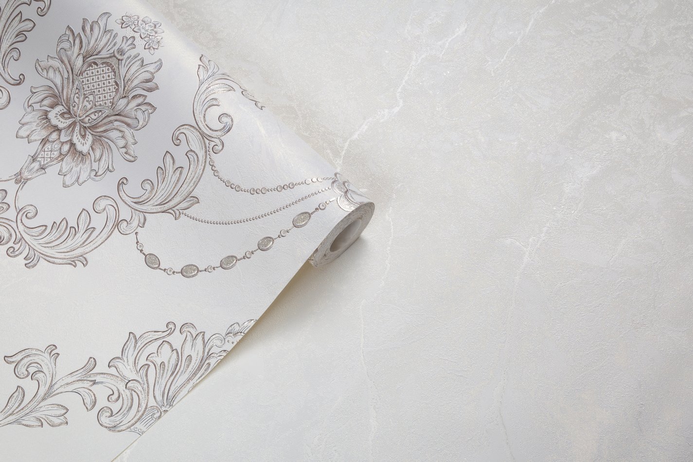 Обои выделяются богатством декоративных приёмов — рельефный орнамент оживает благодаря сверкающим драгоценным штрихам и мягкому перламутровому сиянию. Блестящие золотые и серебряные нюансы окаймляют завитки классических узоров и превращают поверхность в настоящую жемчужину интерьера.