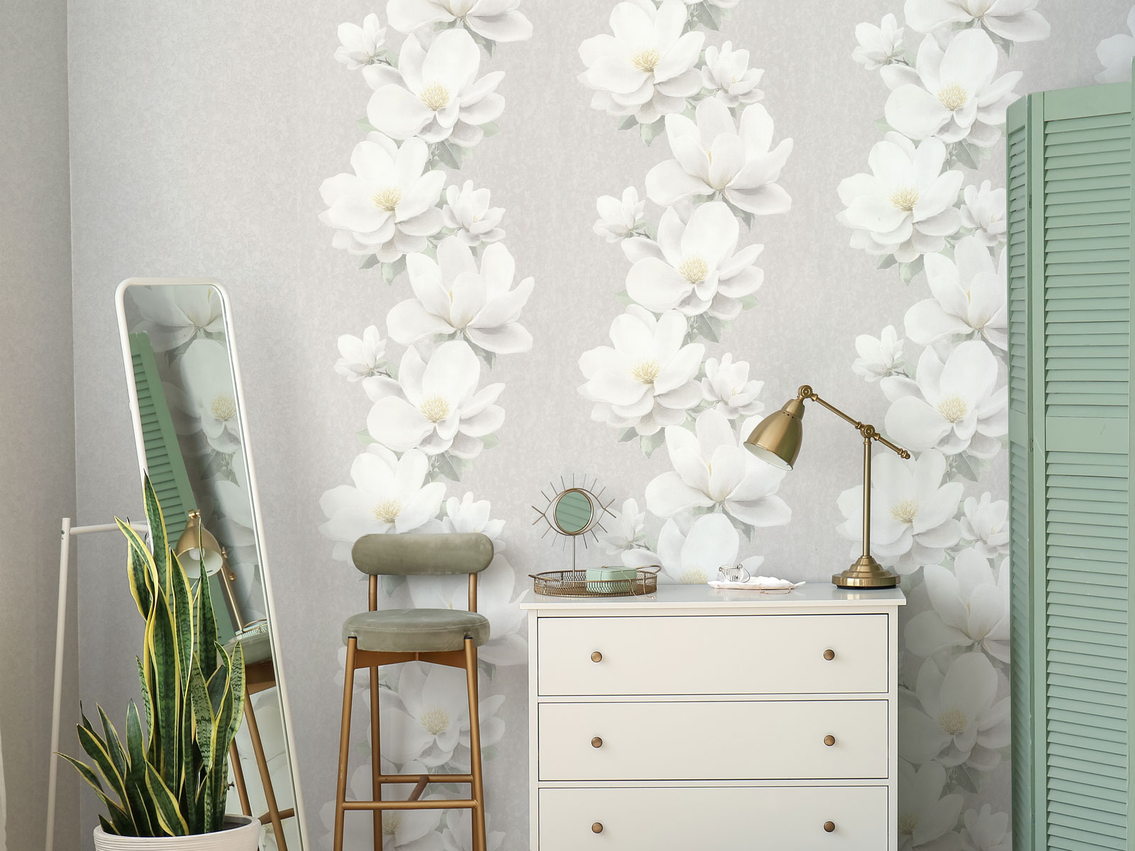 Лёгкое мерцание декоративных элементов подсвечивает лепестки, придавая рисунку объём. Деликатная игра света создаёт приглушённое сияние, а рельефная фактура делает стены выразительными.