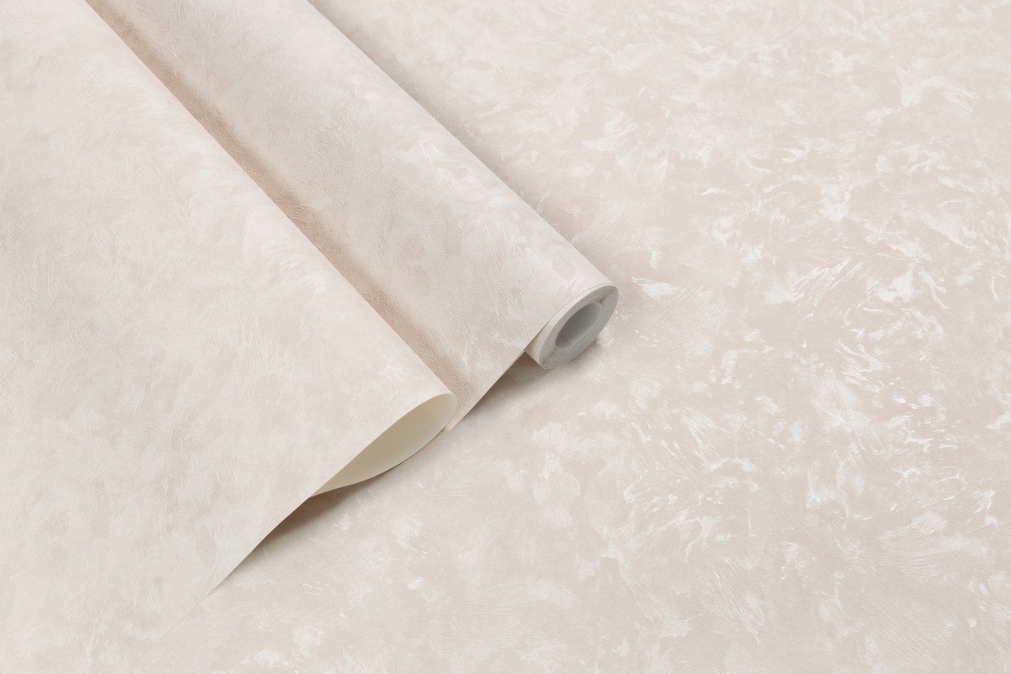 Фактура обоев напоминает декоративную штукатурку марморино с лёгкой зернистостью и чуть шероховатой текстурой. Её мягкий перламутровый отлив красиво раскрывается при разном освещении, придавая поверхности деликатное сияние.