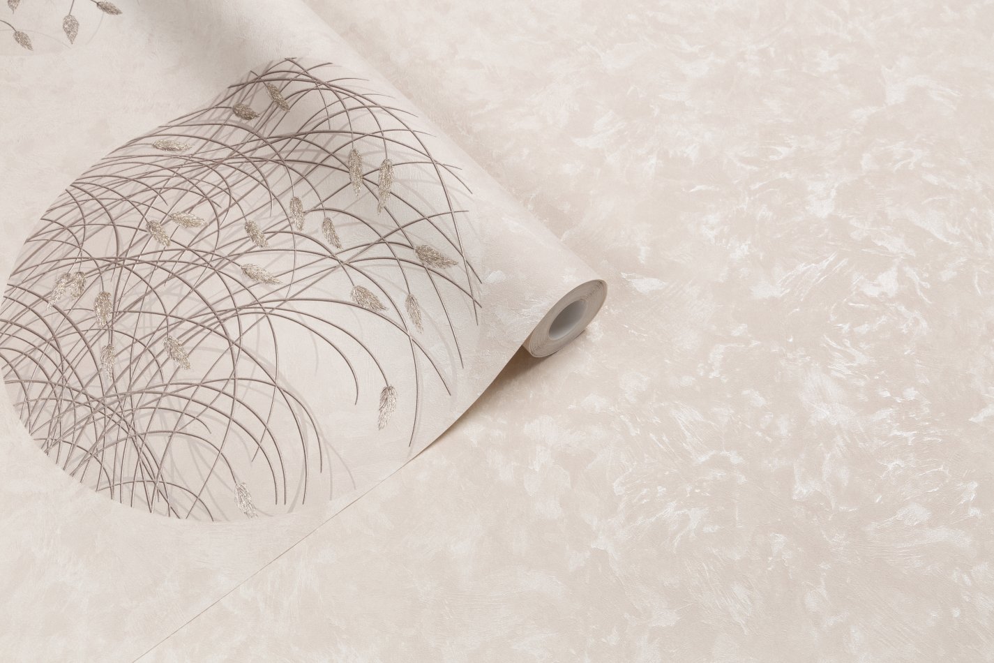 Изящные соцветия и стебли покрыты сияющим металлизированным декором с эффектом фольгирования. Эти глубокие блестящие акценты мягко отражают свет и переливаются словно утреннее солнце скользит по стенам.