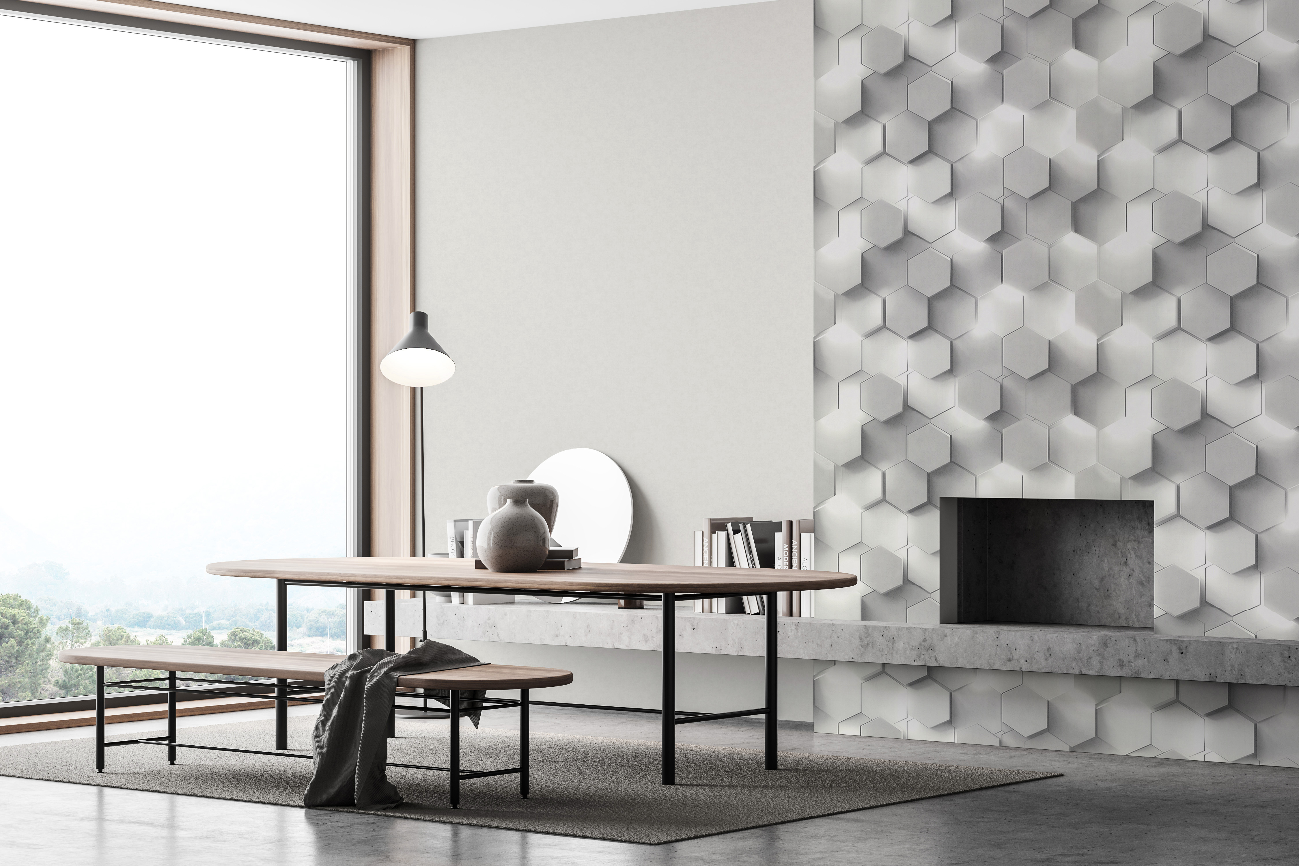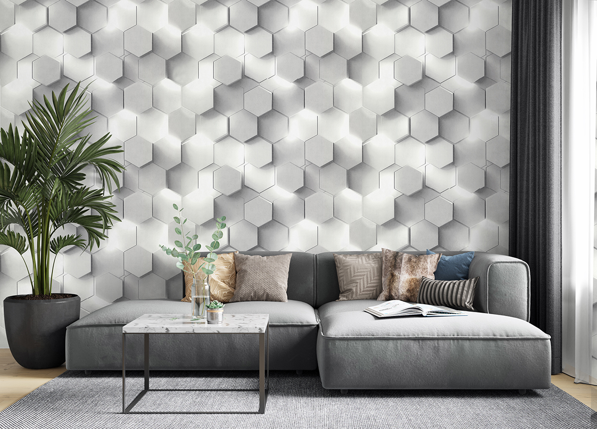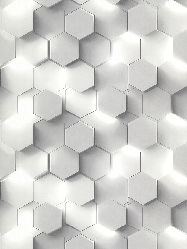 Матовая фактура штукатурки служит фоном для чёткого, но не навязчивого орнамента. Идеальные соты то проступают сквозь реалистичную текстуру, то мягко растворяются в ней. Иллюзия выразительного 3D-эффекта достигается за счёт сложных колористических решений и имитации подсветки – как будто яркий свет прорывается сквозь графичные детали рисунка.
