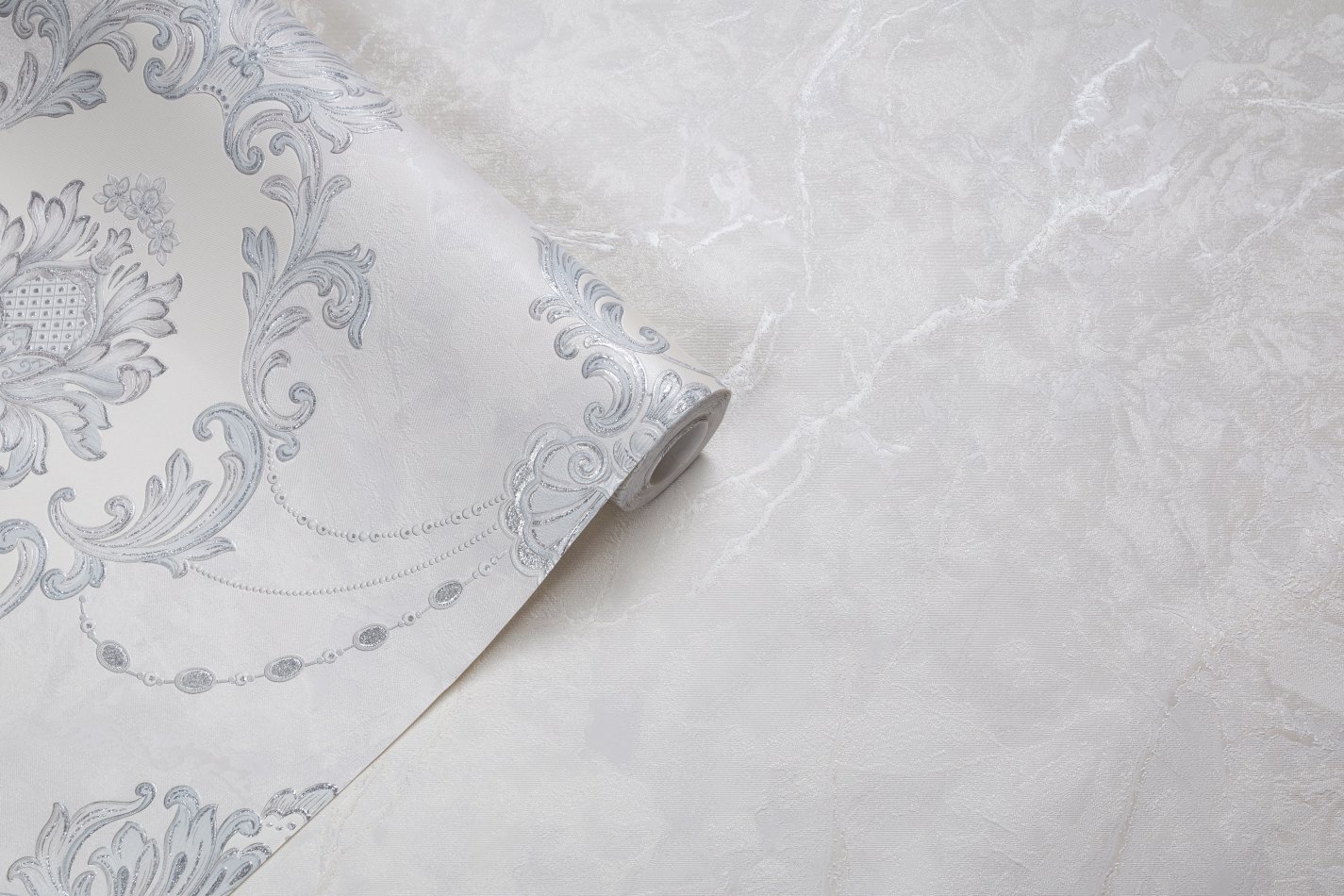 Обои выделяются богатством декоративных приёмов — рельефный орнамент оживает благодаря сверкающим драгоценным штрихам и мягкому перламутровому сиянию. Блестящие золотые и серебряные нюансы окаймляют завитки классических узоров и превращают поверхность в настоящую жемчужину интерьера.