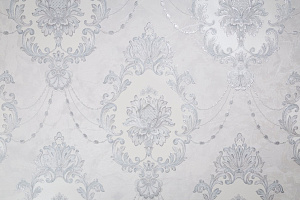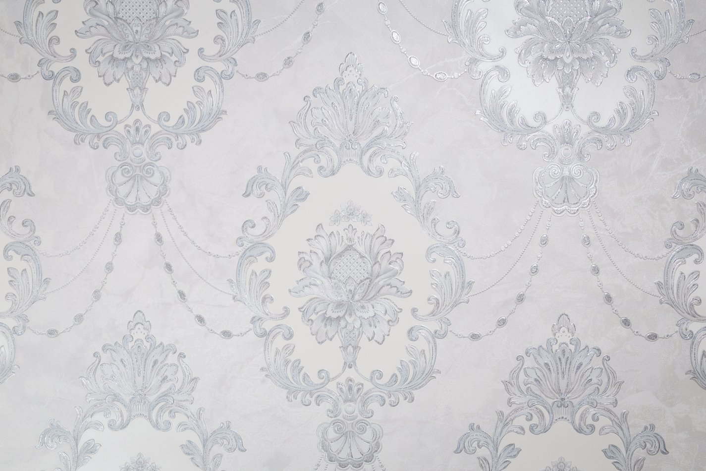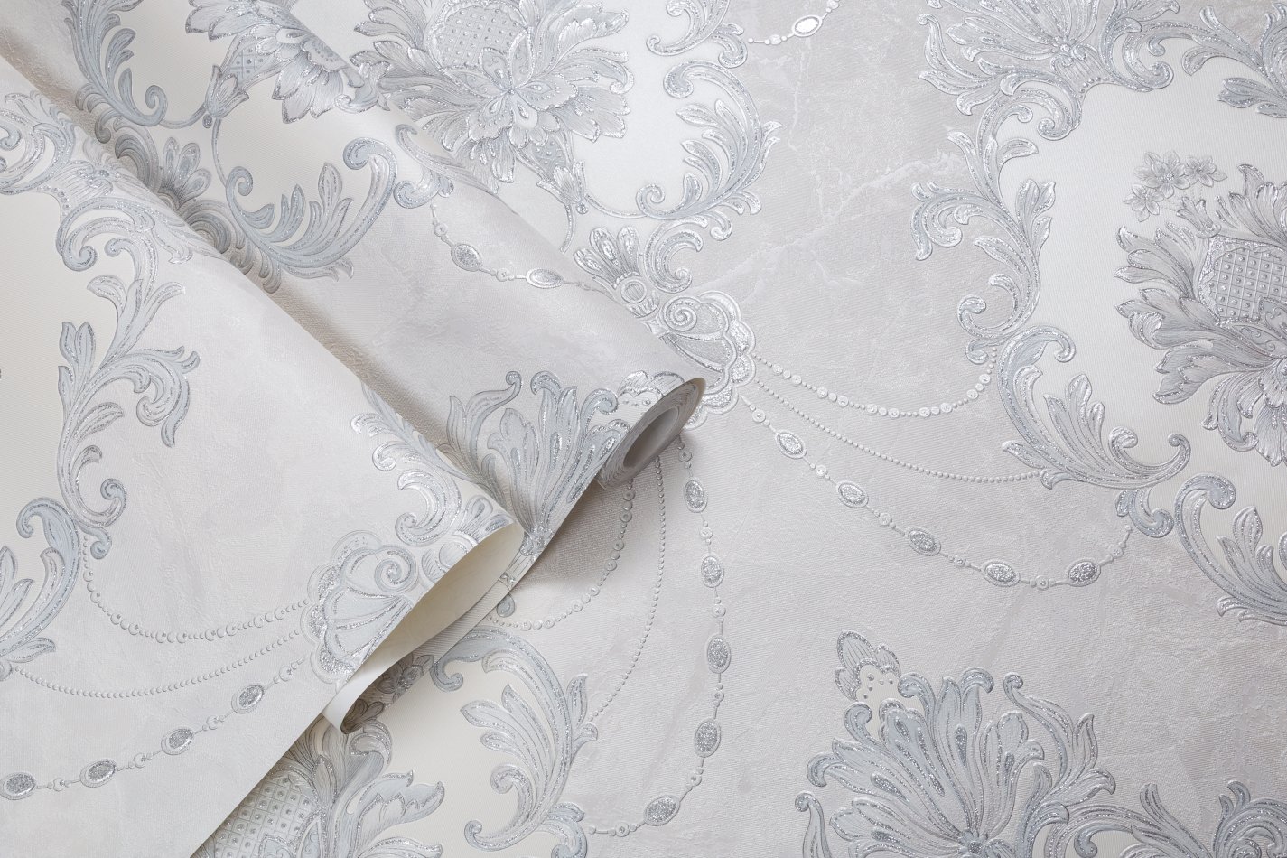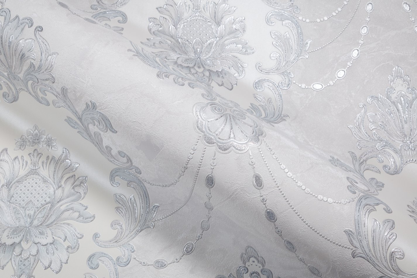 Обои выделяются богатством декоративных приёмов — рельефный орнамент оживает благодаря сверкающим драгоценным штрихам и мягкому перламутровому сиянию. Блестящие золотые и серебряные нюансы окаймляют завитки классических узоров и превращают поверхность в настоящую жемчужину интерьера.
