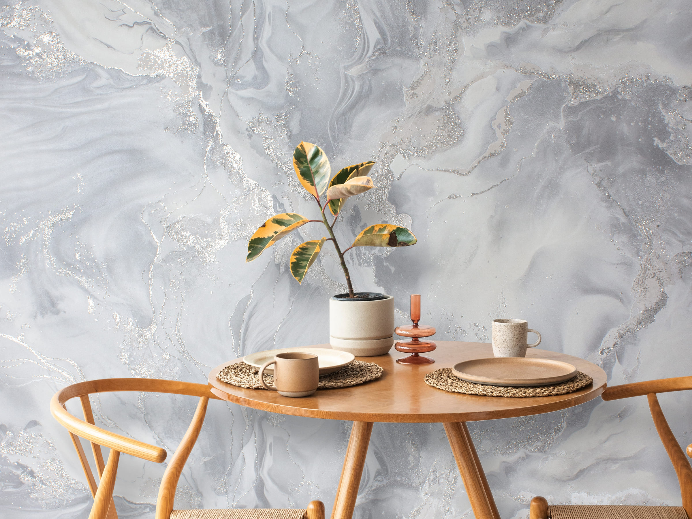 Как вам идея создать с помощью обоев эффектное панно-фреску с великолепными мраморными разводами, каскадом золотого напыления и объемным шелковым тиснением? Нам кажется, что такое панно эффектно будет смотреться в классическом интерьере в том числе.