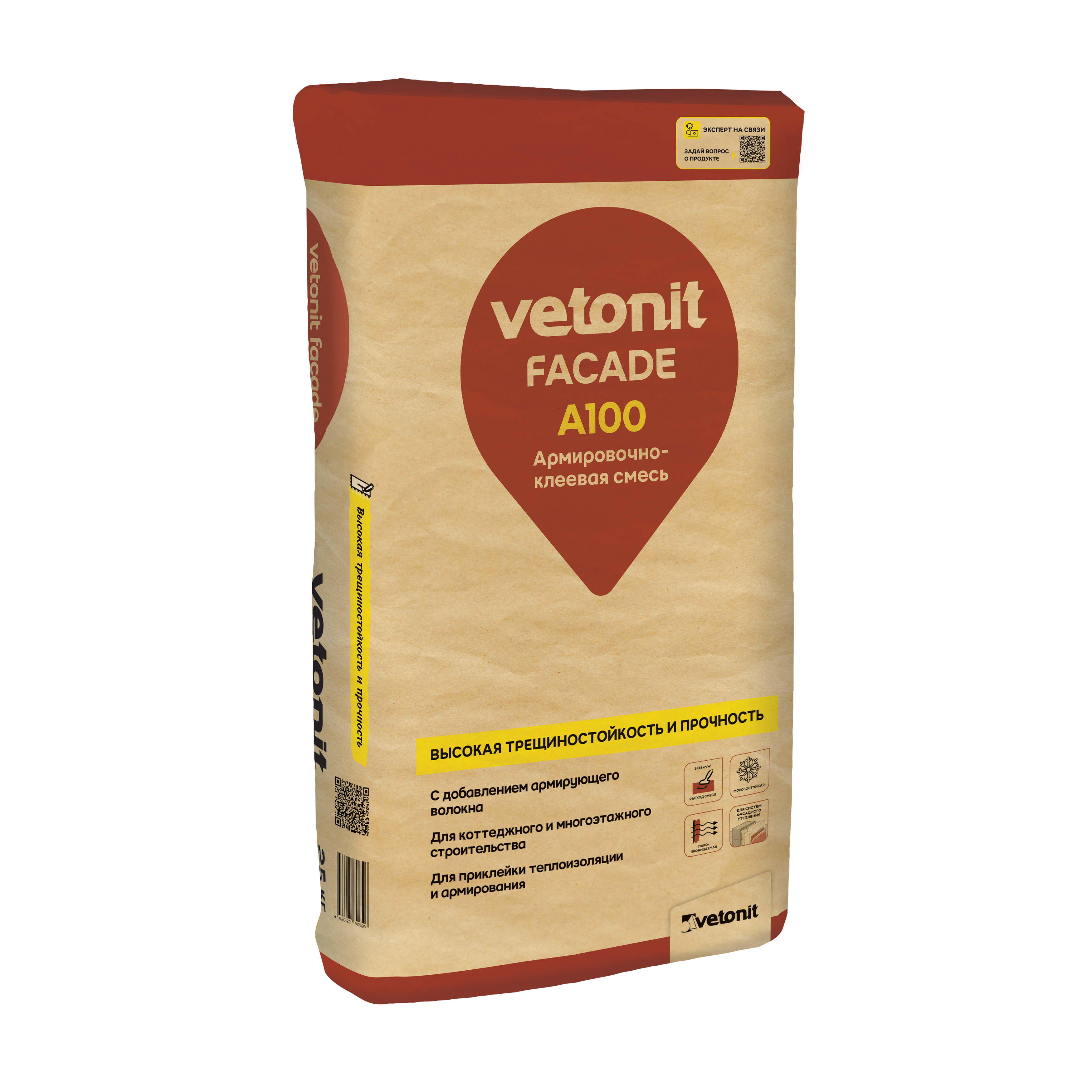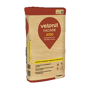 Vetonit facade A100 - армировочно-клеевая смесь для пенополистирола и минеральной ваты. Подходит для и создания базового штукатурного армированного слоя в СФТК. Пластичная и удобная в работе, благодаря увеличенному времени корректировки смеси до 15 минут. Обладает высокой морозостойкостью не менее 100 циклов и паропроницаемостью. Для нанесения на следующие основания: выдержанный бетон (старше 6 мес.). Поверхности, облицованные фасадной плиткой; кирпичная кладка из керамического, силикатного и клинкерного кирпича; поверхности, выполненные цементными, цементно-известковыми, известково-цементными штукатурками и шпаклевками; поверхности из ячеистого и керамзитобетона.