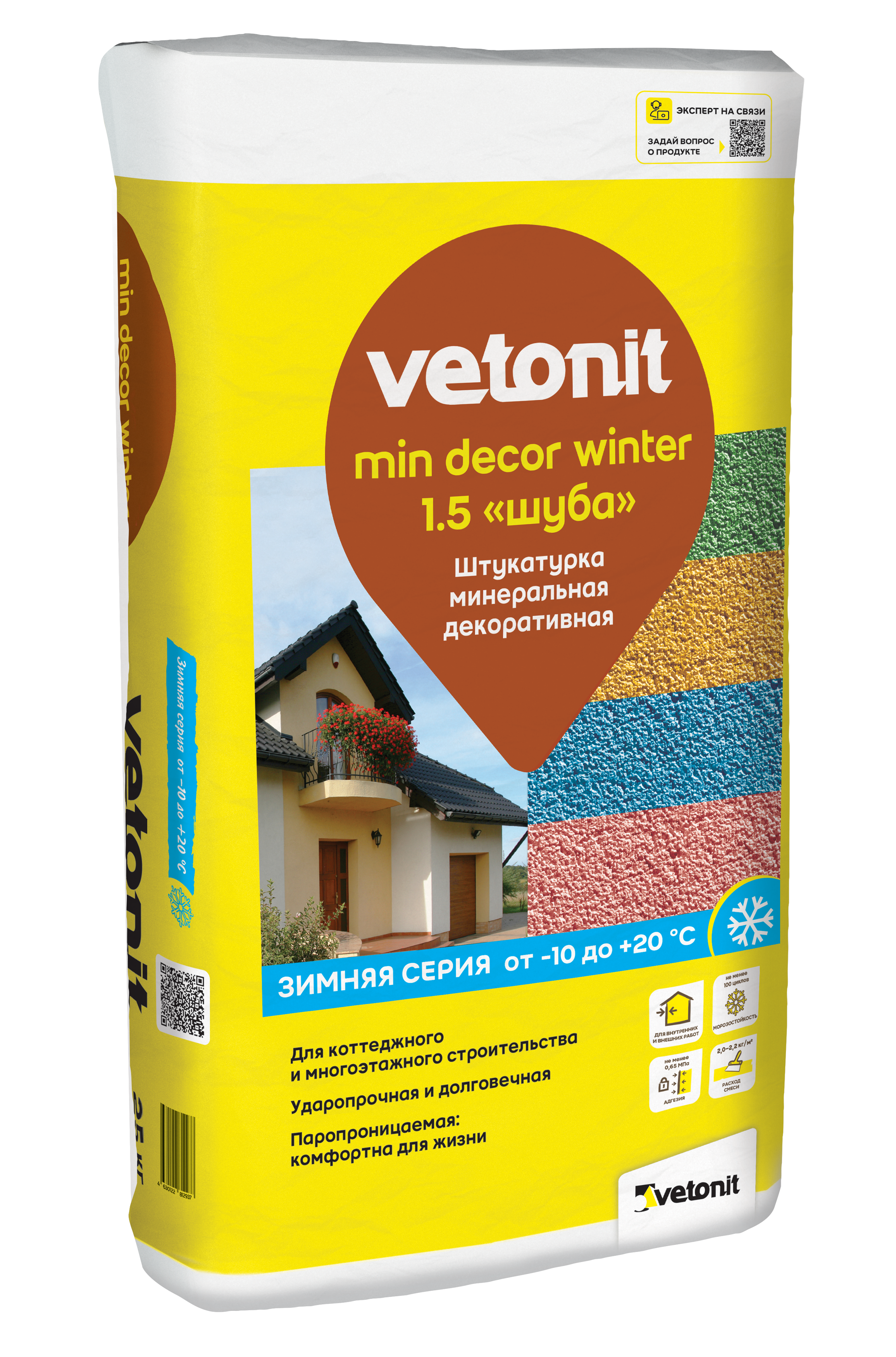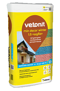 Vetonit min decor winter - высококачественная декоративная минеральная штукатурка для работ при отрицательной температуре до -10 °С. Подходит для декоративной отделки стен внутри и снаружи помещений, с последующей окраской вододисперсионными красками. Является негорючим и безопасным материалом. Обладает хорошей паропроницаемостью и морозостойкостью.